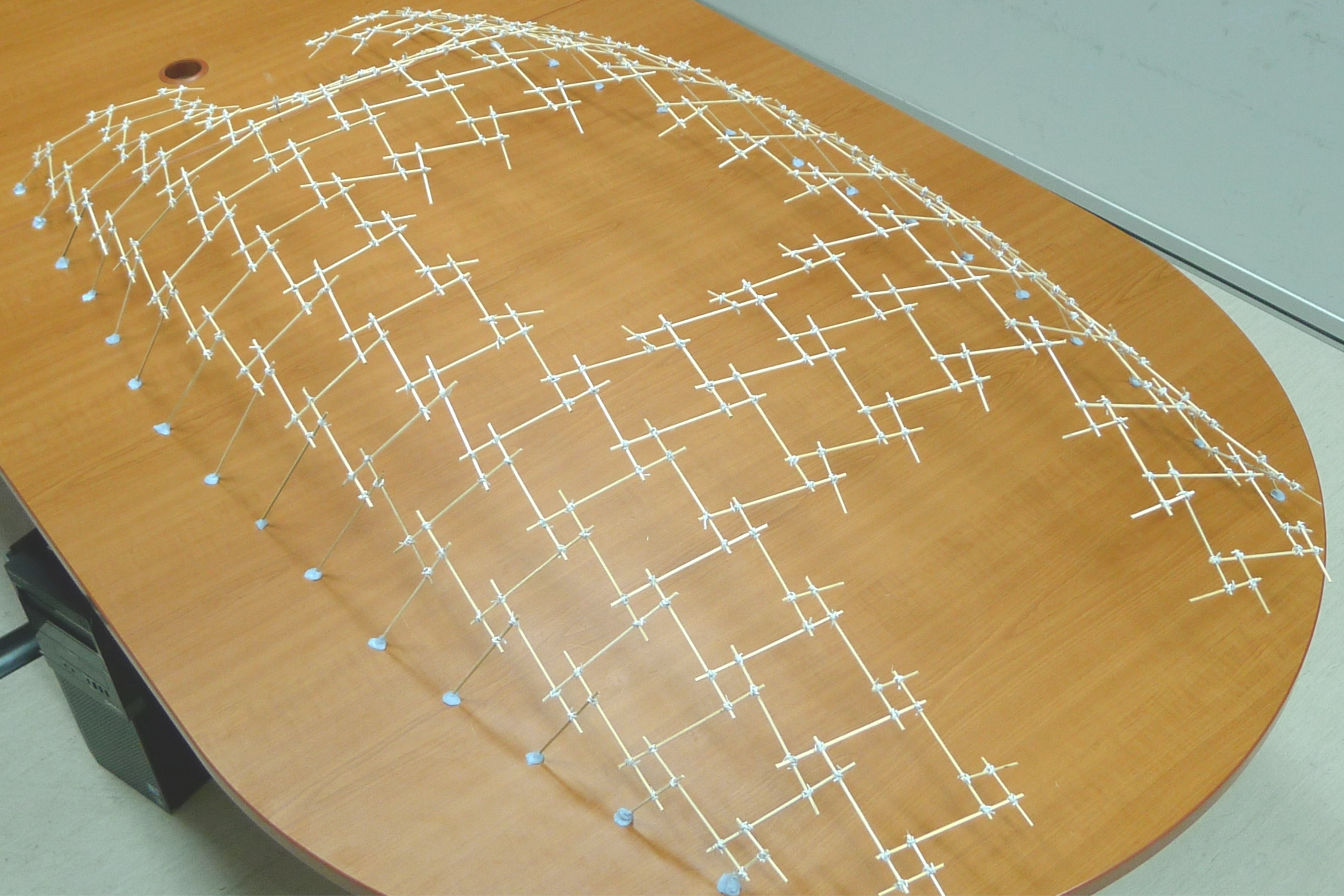 A large reciprocal frame structure (with 267 rods) designed by our approach. There are no central supports as rods rest on and are supported by adjacent rods reciprocally.