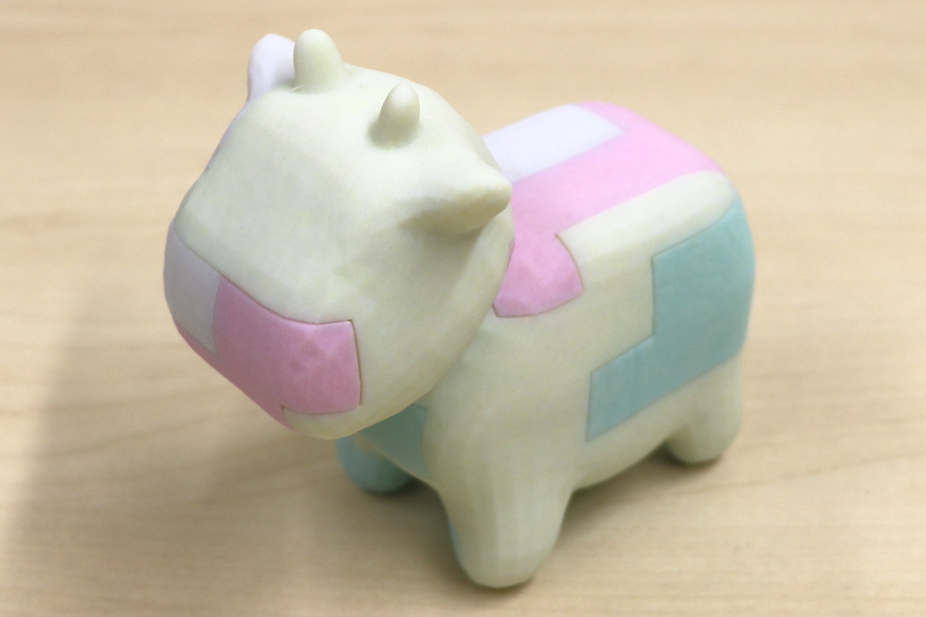 A level-6 interlocking Cow puzzle (with 4 pieces) designed by our approach. The puzzle requires 6 moves to take out the first piece (in blue color).