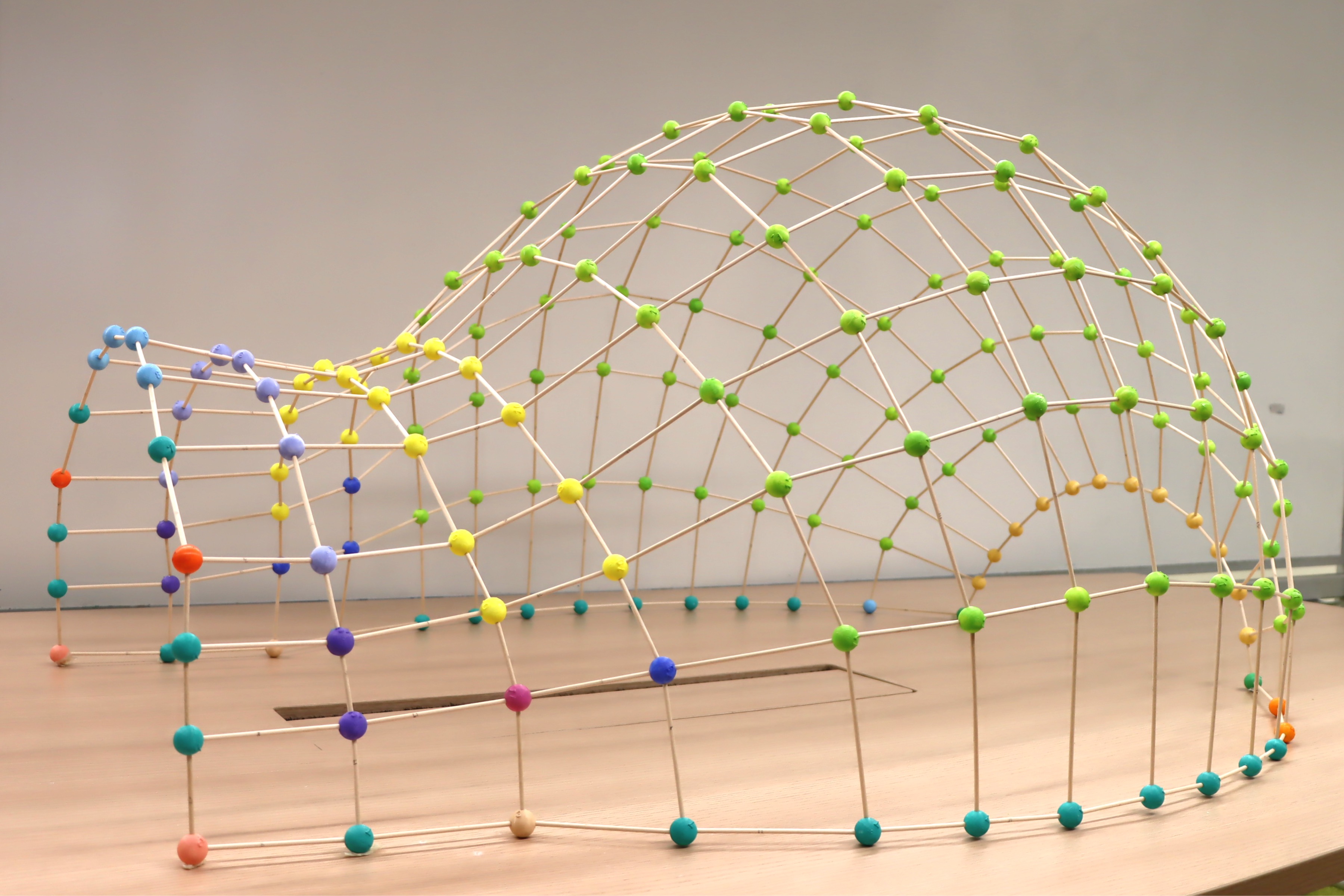 A wireframe structure, Igloo, containing 196 nodes and 364 rods optimized to 14 classes of nodes and 30 classes of rods for rationalization using our approach.