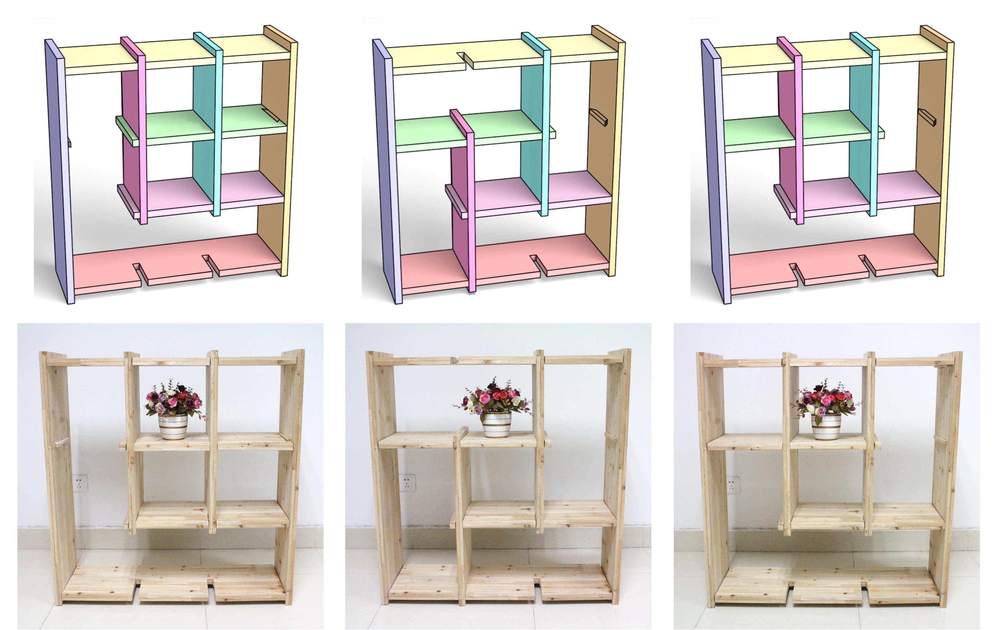 A reconfigurable boolshelf of three different forms produced by our approach, where parts are interlocking in each form.